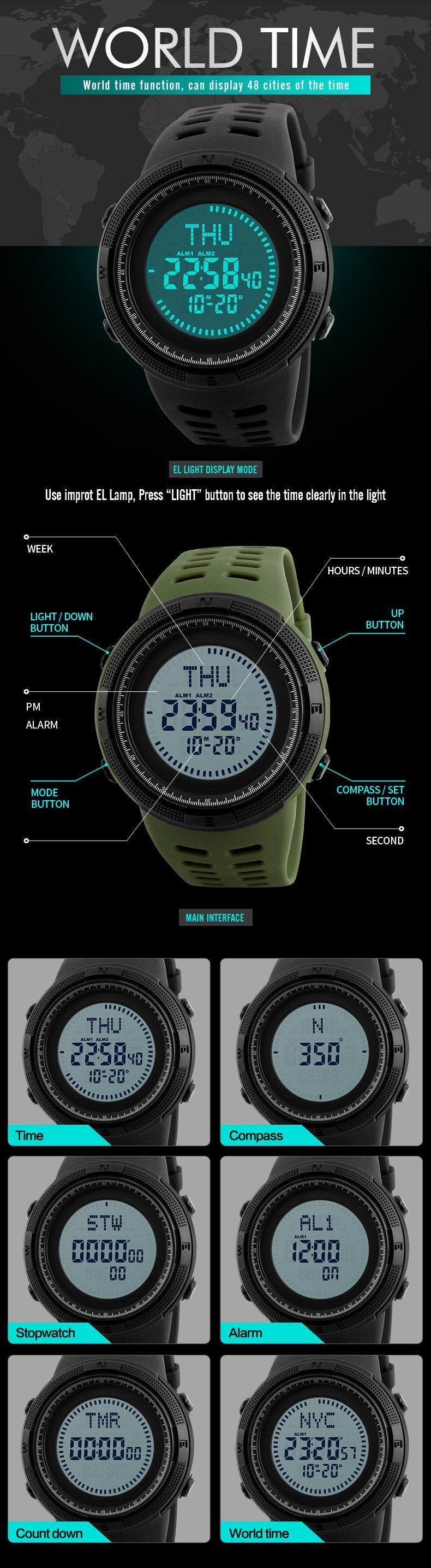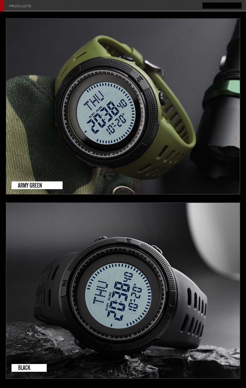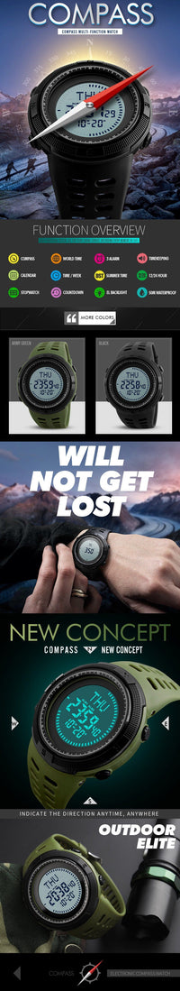 Feature: Back Light, Alarm,Water Resistant, Shock Resistant, Stop Watch, Complete Calendar, Compass